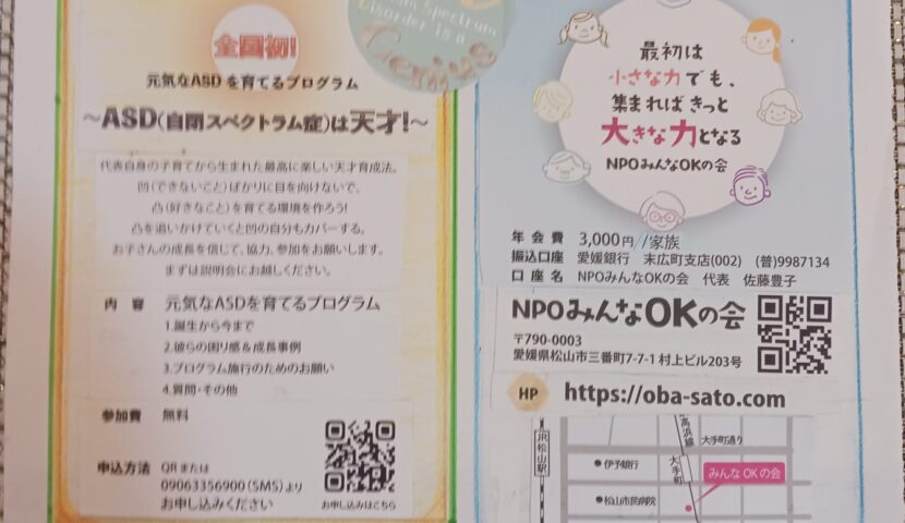この度、「子ども発達支援研究所」附属OBA相談室と「NPOみんなOKの会」を起ち上げました。ASDの子を育て、臨床心理士、公認心理師となり、多くの研修会に参加し、スクールカウンセラーとして、不登校生やいじめ問題に取り組んできました。また、特別支援相談員として、年間100人以上の相談を受けました(プロフィール参照)。その経験を基に、当組織は、時に応じて、「療育」「医療」「教育」機関とも連携し、子どもたちが「現在の辛さから解き放たれ」「夢を持ち」「自立した大人」になるまで、子ども本位のサポートを考え、実践し続けることを約束します。詳細は以下の項目からご覧ください。また、定期的に研修会、報告会、相談会を開催します。時々、ページ下のBLOGをチェックしてください。多くの方々と出会うことを楽しみにしております。どうぞよろしくお願いいたします。