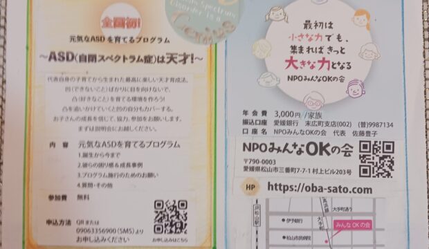 NPOみんなOKの会 9月の定例会開催は14日(日)と28日(日)開催1日前までに09063356900までSMSでお申し込みください。名前・参加種別(見学・体験・参加)枠名(A~D)詳細は「みんなOKの会」のページで 2025.09.06 7月13日(日)定例会開催。以降8月31日まで定例会は学校長期休業中なのでお休みです。 放課後デイのマップ作成中 前の記事 第一回 元気なASDを育てるプログラム説明会開催10月5日(日)コムズ(松山市三番町6-4-20)第二会議室 14:00~16:00 参加費無料 内容① ASDの子育て経験 ② 彼らの困り感&成長事例 ③ プログラム施行のためのお願い ④ 質問・その他 参加をお待ちしております。小さな力も集まって大きな力に! 次の記事